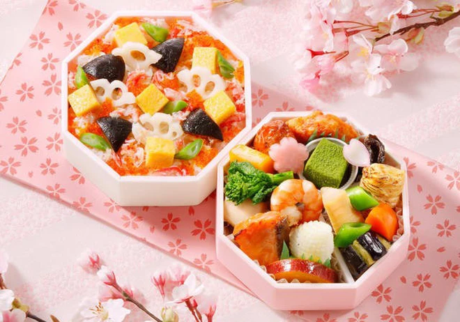 Bento mùa xuân: Các hộp cơm Hanami Bento được bày trí cầu kỳ với nhiều màu sắc tượng trưng cho sự sinh sôi nảy nở: màu hồng của tôm/cá hồi, màu vàng của trứng, màu xanh của đậu và măng tây.